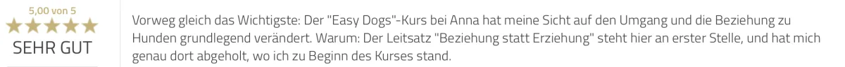 Exklusive EasyDogs Community: Du bist mit mir über die EasyDogs Telegram-Gruppe in Verbindung. Bei dringenden Angelegenheiten bin ich auch hier für dich da und helfe dir weiter.